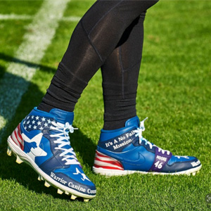 The cleats, created by artist Alex Andrews of A22 Customs, feature bold imagery that reflects WCC’s work pairing highly trained service dogs with Veterans. Beyond placement, WCC also engages Service Members in its Mission Based Trauma Recovery (MBTR) program, where Veterans help train service dogs for fellow Warriors. The process offers therapeutic benefits while building skills like communication, confidence, accountability and emotional regulation — all through an act of service.