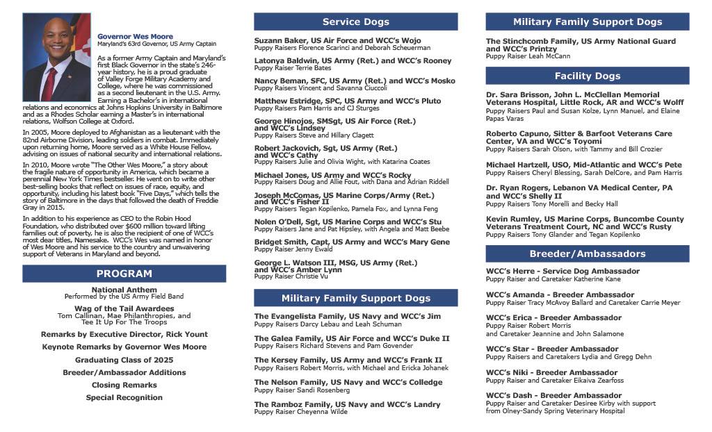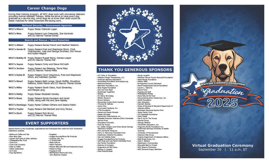 WCC’s 2025 Graduation ProgramSeptember 12, 2025Click Here to Download WCC’s 2025 Graduation Program https://warriorcanineconnection.org/wp-content/uploads/logo_white_sm.svg 0 0 WCC Comms https://warriorcanineconnection.org/wp-content/uploads/logo_white_sm.svg WCC Comms2025-09-12 19:10:162025-09-12 20:27:52WCC’s 2025 Graduation Program
